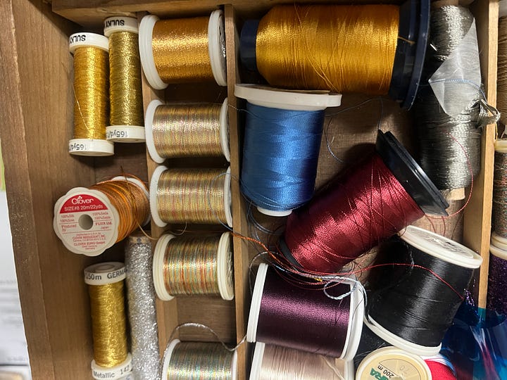 I even carried 80 wt cotton thread - in white and ecru, for VERY FINEST Thread - perfect for heirloom lace work, especially hemstitching, as the fine thread didn’t fill up the hole from the wing needle! Madeira was the brand for that thread. I also remember ‘Tanne 80’ - I believe I got from Martha Pullen Company way back then.